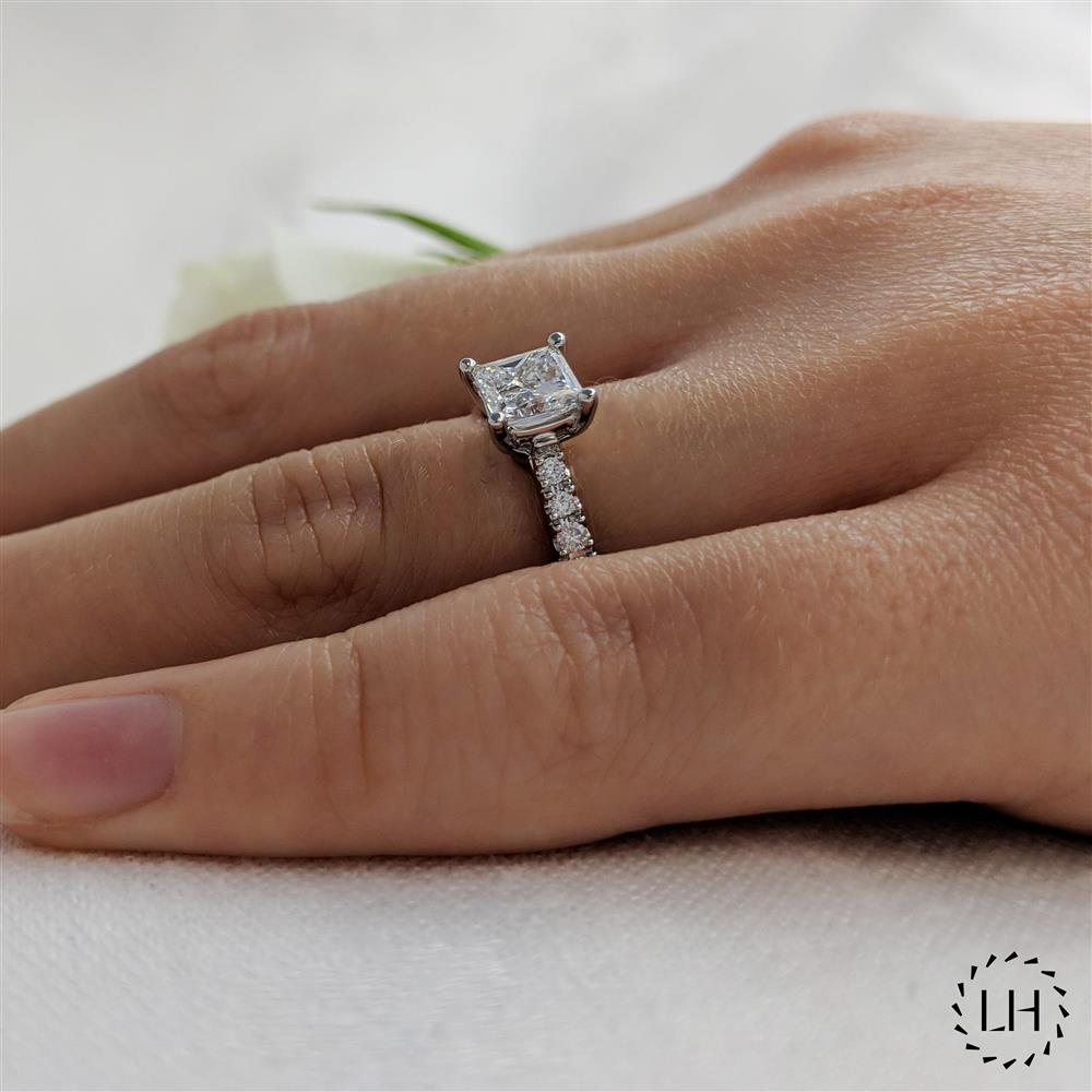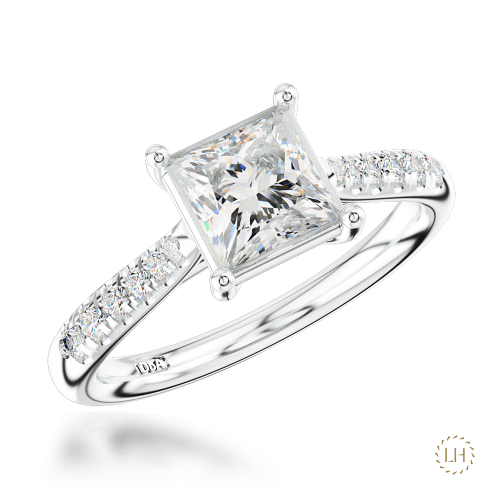 Princess cut diamond engagement ring with scalloped set diamond shoulders. In a 4 claw setting all in platinum